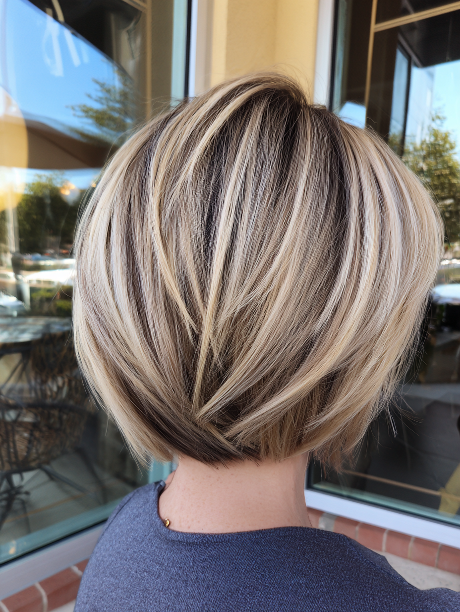 A stacked bob with highlights adds dimension that helps fine hair appear thicker. The highlight placement enhances the layers and reflects light across the surface.