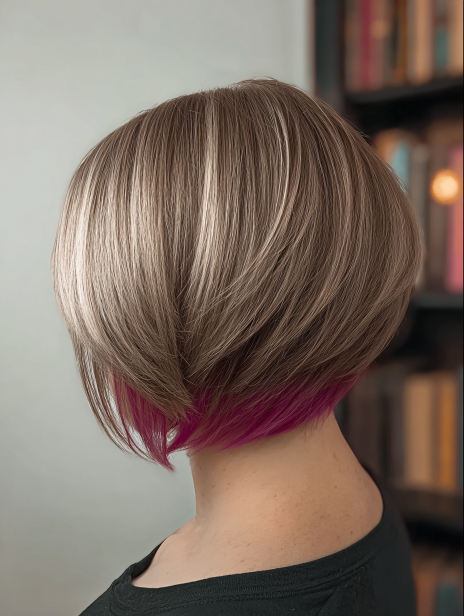 This stacked bob uses underlayer color to create a subtle peek-through effect that adds personality.