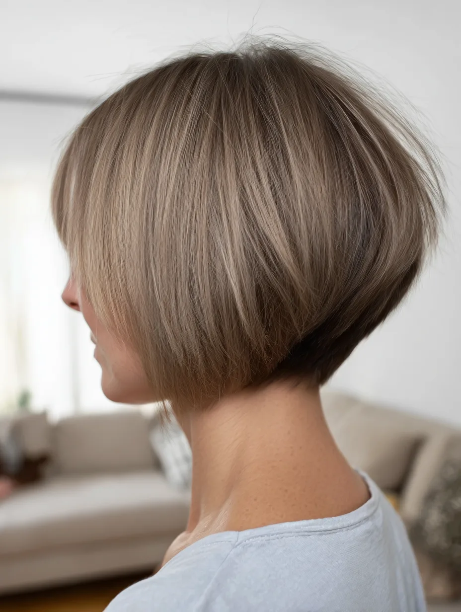 This stacked bob focuses on crown volume, which helps fine hair appear fuller. The layers lift the top and create a rounded contour.