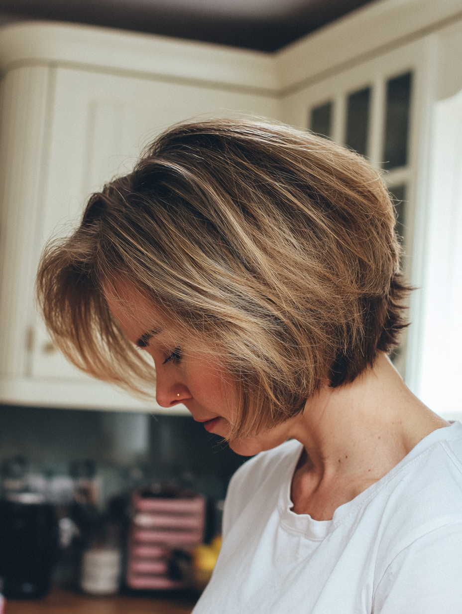 A textured stacked bob adds intentional movement through light choppy layers. These layers create separation that makes fine hair appear fuller without extra weight.