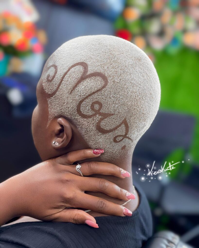 This unique TWA features a close-cropped buzz cut dyed in a bold platinum blonde shade. What makes it stand out is the intricate script design shaved into the back, creating an artistic and personal statement.