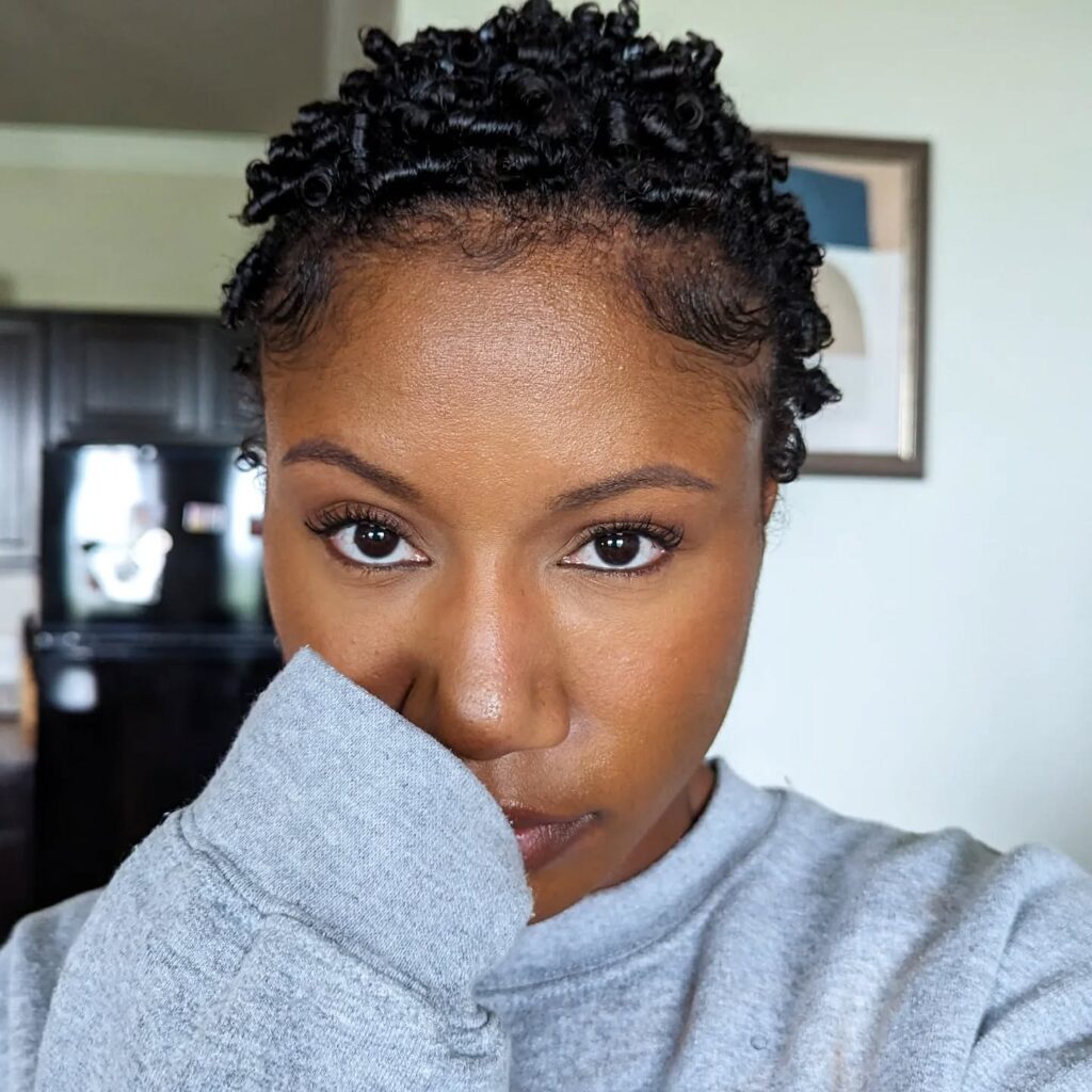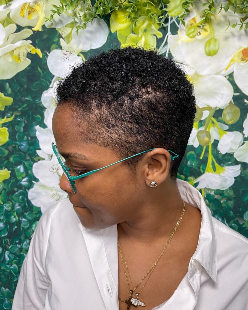 This timeless TWA showcases a natural, coily texture that’s softly shaped for a flattering silhouette. The curls are defined and sit close to the scalp, offering a neat and low-maintenance look.