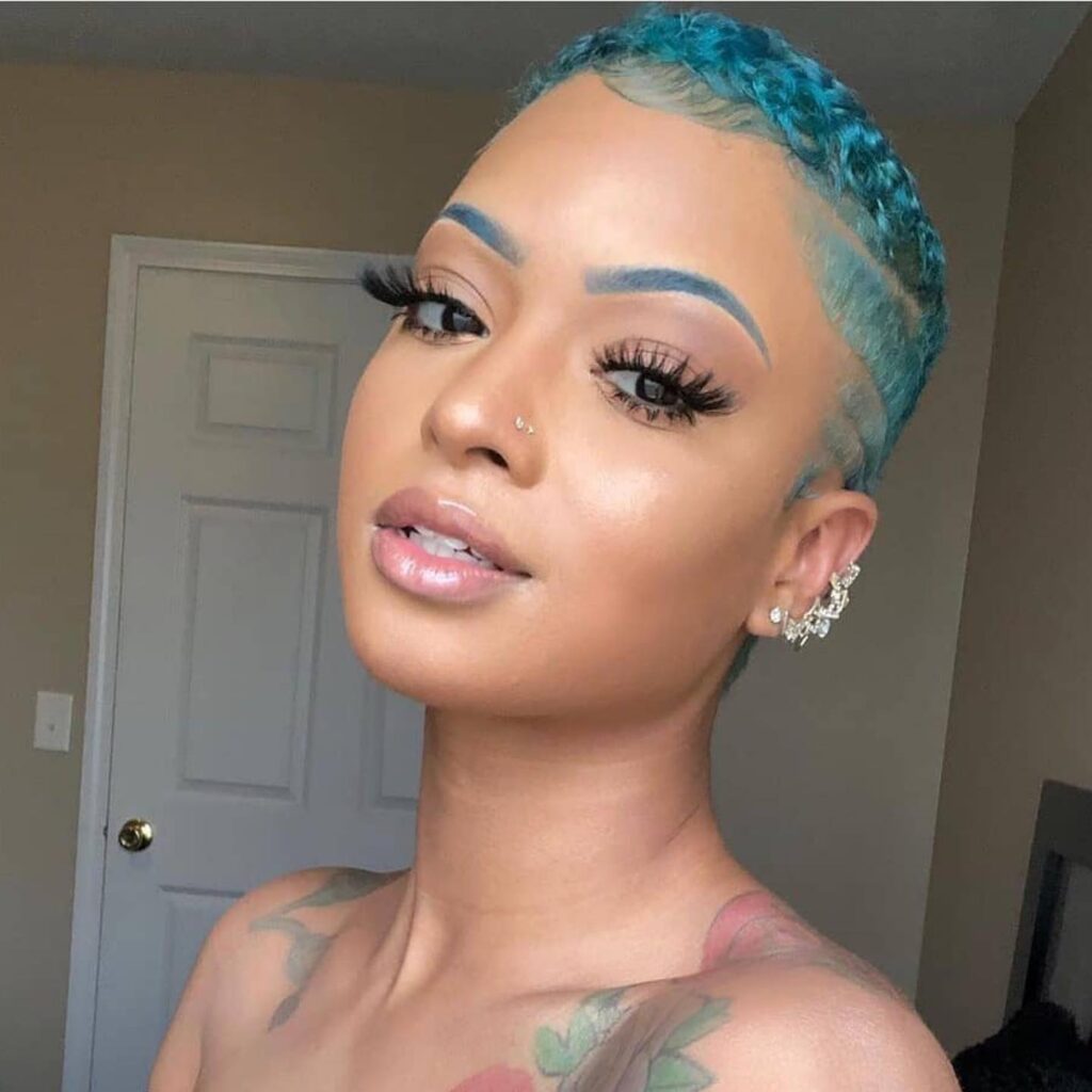 The curls on top remain tight and defined, offering a soft texture against the edgy cut. Matching blue eyebrows complete the statement, but the hairstyle itself shines on its own. It’s a fearless and expressive look that blends creativity, structure, and natural texture beautifully.