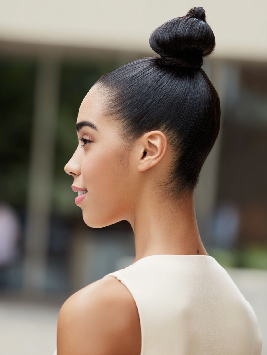 A sleek high bun brings instant lift and drama to long hair without feeling overdone. Pulled upward and smoothed close to the scalp, this updo emphasizes facial features and elongates the neck. It works best on straight or well smoothed hair and holds up well throughout long days. This style suits both professional settings and evening plans, especially when paired with bold earrings. A light styling cream helps maintain shine and control flyaways.