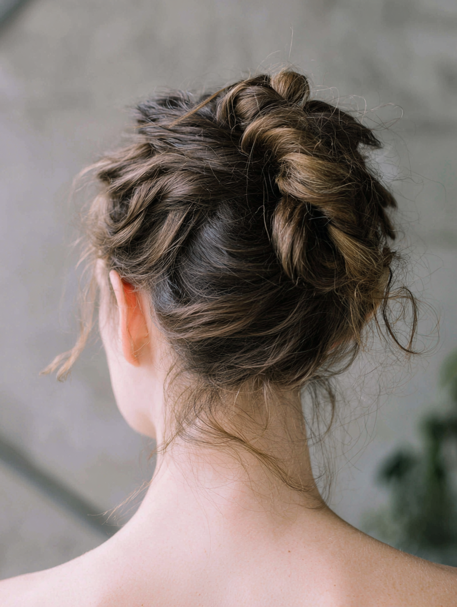 A high braided bun adds structure and lift, making long hair feel lighter and more dynamic. Hair is braided first, then wrapped into a bun positioned high on the head. This creates visual interest while keeping the style secure. It works well for thick hair that needs control and balance. The height draws attention upward, flattering many face shapes. Light hold spray helps keep the braid defined without making it feel stiff.