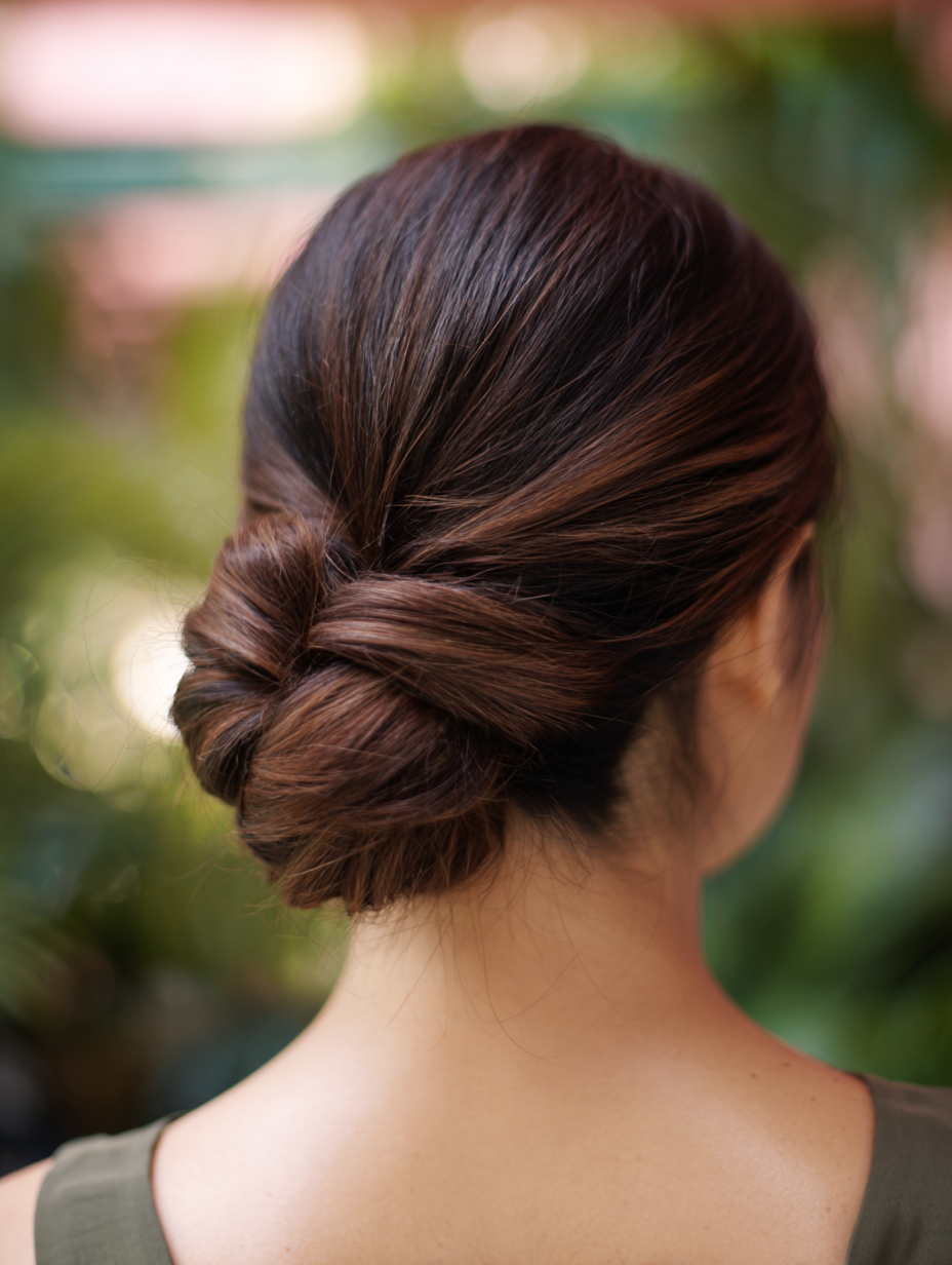 The twisted low knot is simple, refined, and easy to wear with long hair. Hair is divided into sections, gently twisted, then secured into a compact knot at the nape. This approach adds texture without looking busy. It works well for straight and slightly wavy hair types and holds shape throughout the day. The style keeps hair off the face while still feeling soft. A light hold spray helps maintain definition without stiffness.