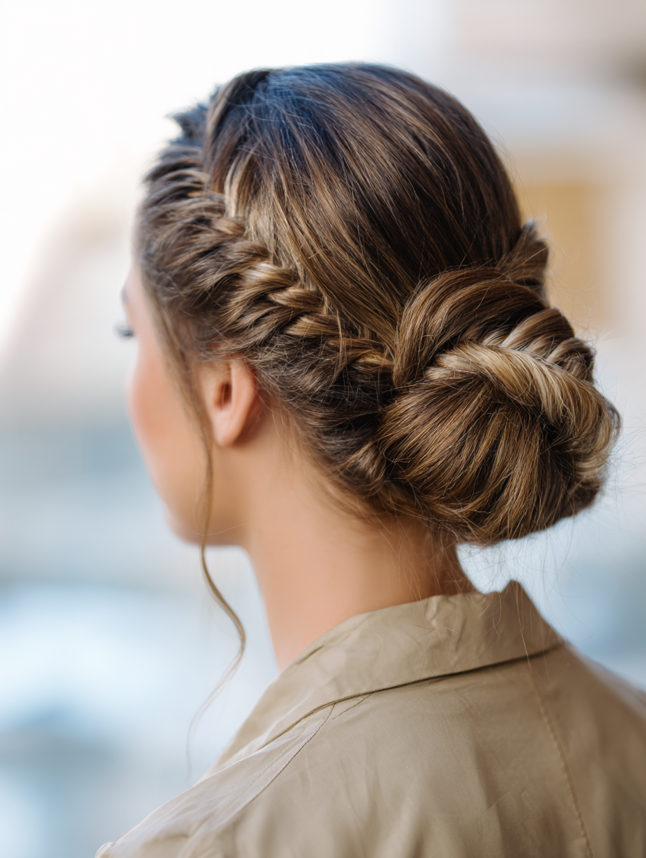 A braided low chignon blends classic structure with subtle texture, making it a reliable option for long hair. The braid adds interest before the hair is shaped into a chignon at the nape. This keeps the style secure while avoiding a flat finish. It works especially well for medium to thick hair and holds comfortably throughout the day. Soft volume at the crown balances the look, while gentle face framing pieces keep it relaxed and wearable.