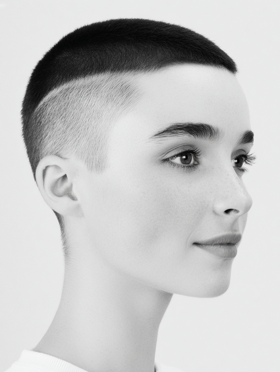 The minimalist buzz pixie with shaved sides embraces simplicity and strength.