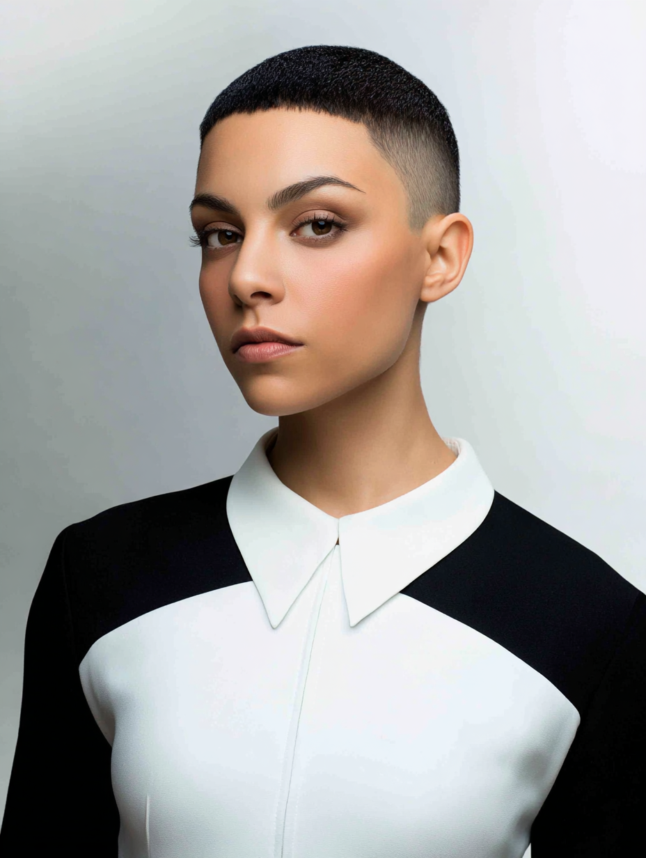 The minimalist buzz pixie with shaved sides embraces simplicity and strength.