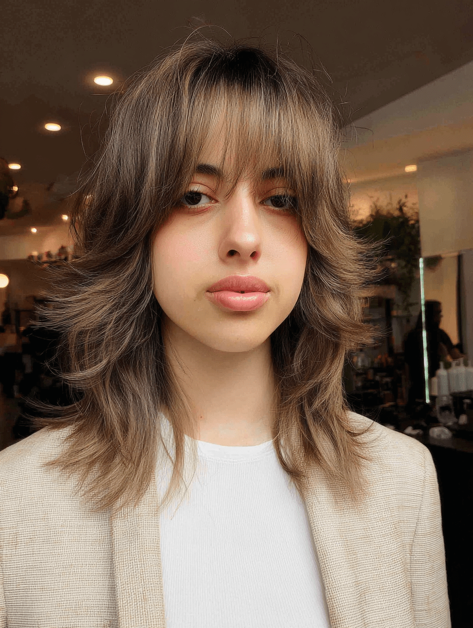 A modern wolf cut adds volume through layered contrast and controlled texture.