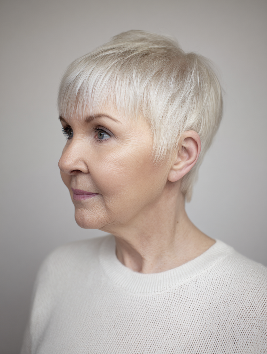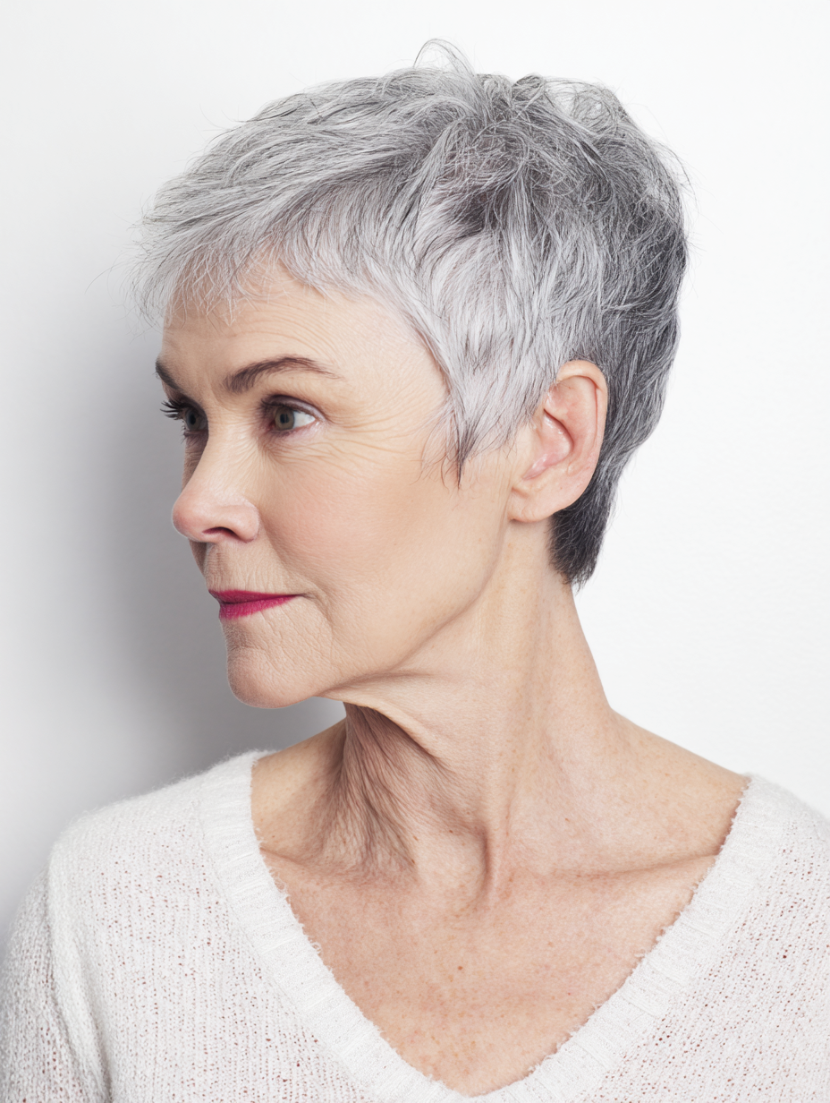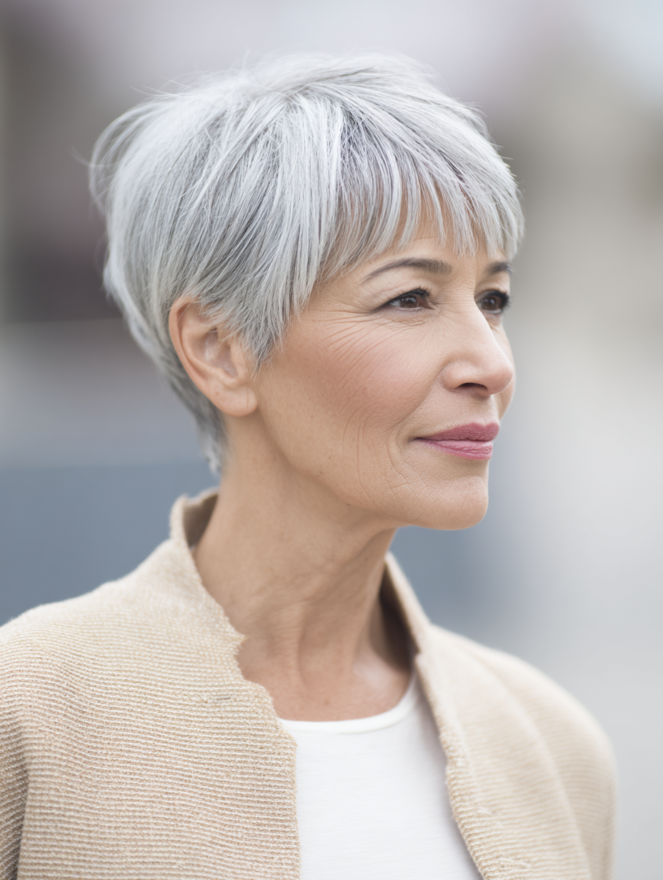 A layered gray pixie highlights natural tones while offering dependable shape and easy maintenance.