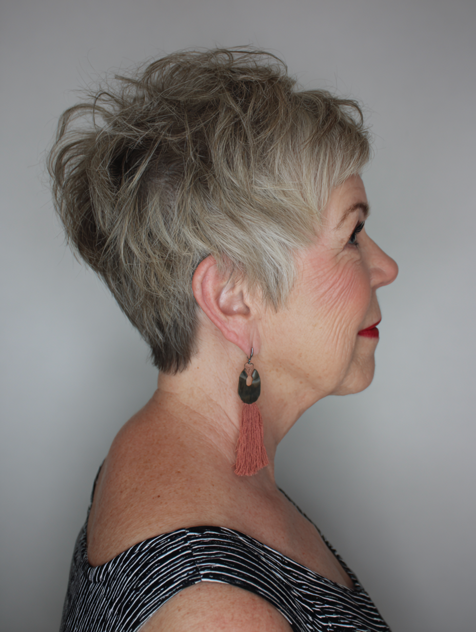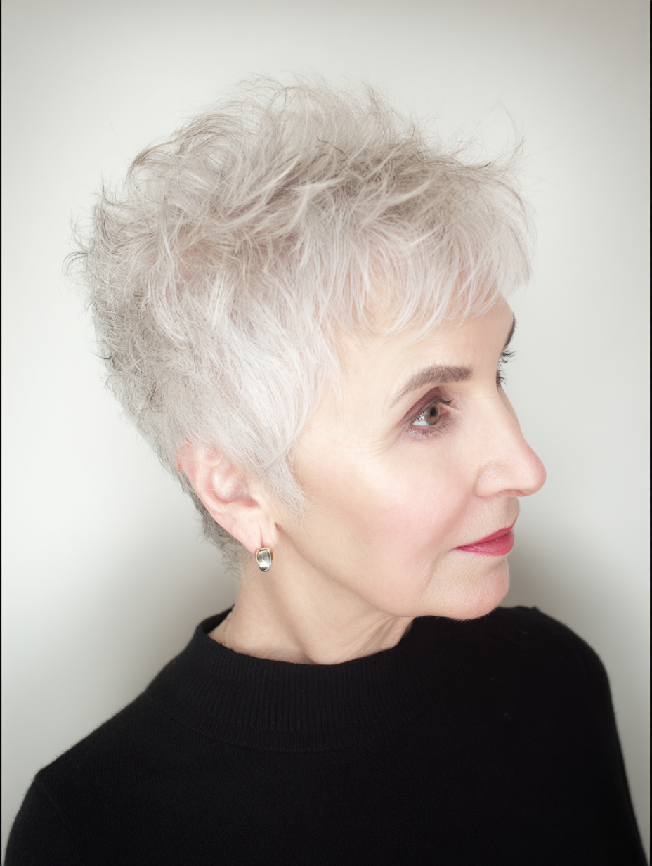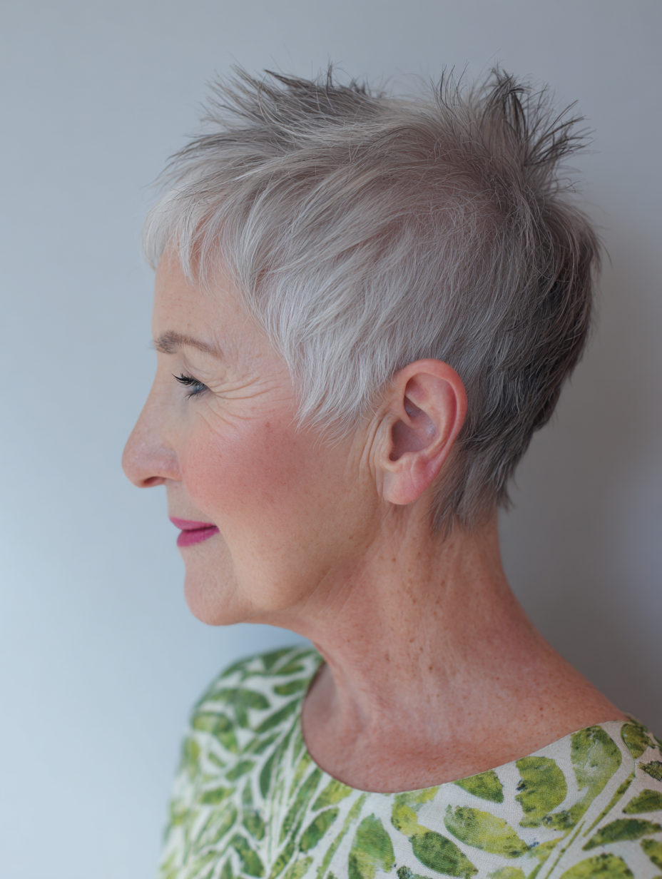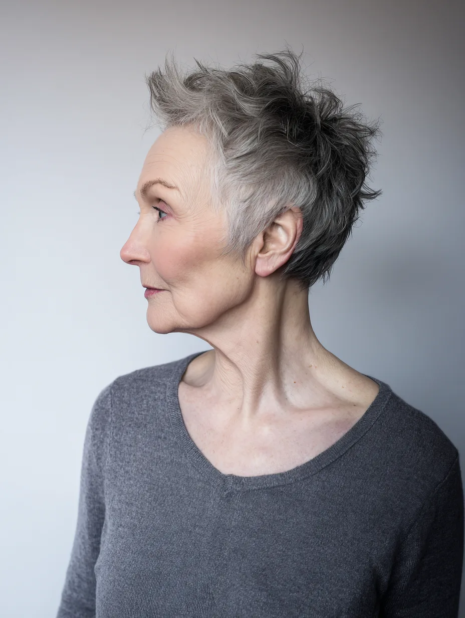 A salt-and-pepper pixie showcases natural color variation while keeping styling time low. Short sides maintain a tidy outline, and a lightly textured top adds movement without effort.