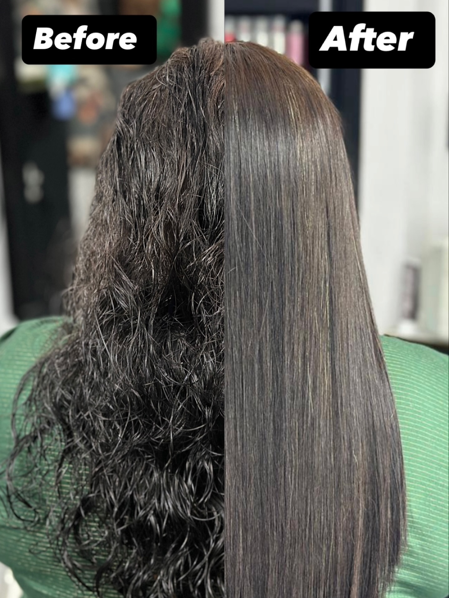 A keratin treatment transforms frizzy hair into smooth, shiny strands.