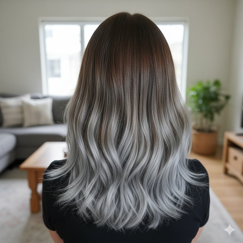 This look keeps the top section a natural brown while shifting into silver at the ends. The color transition appears soft because the silver lightens gradually.
