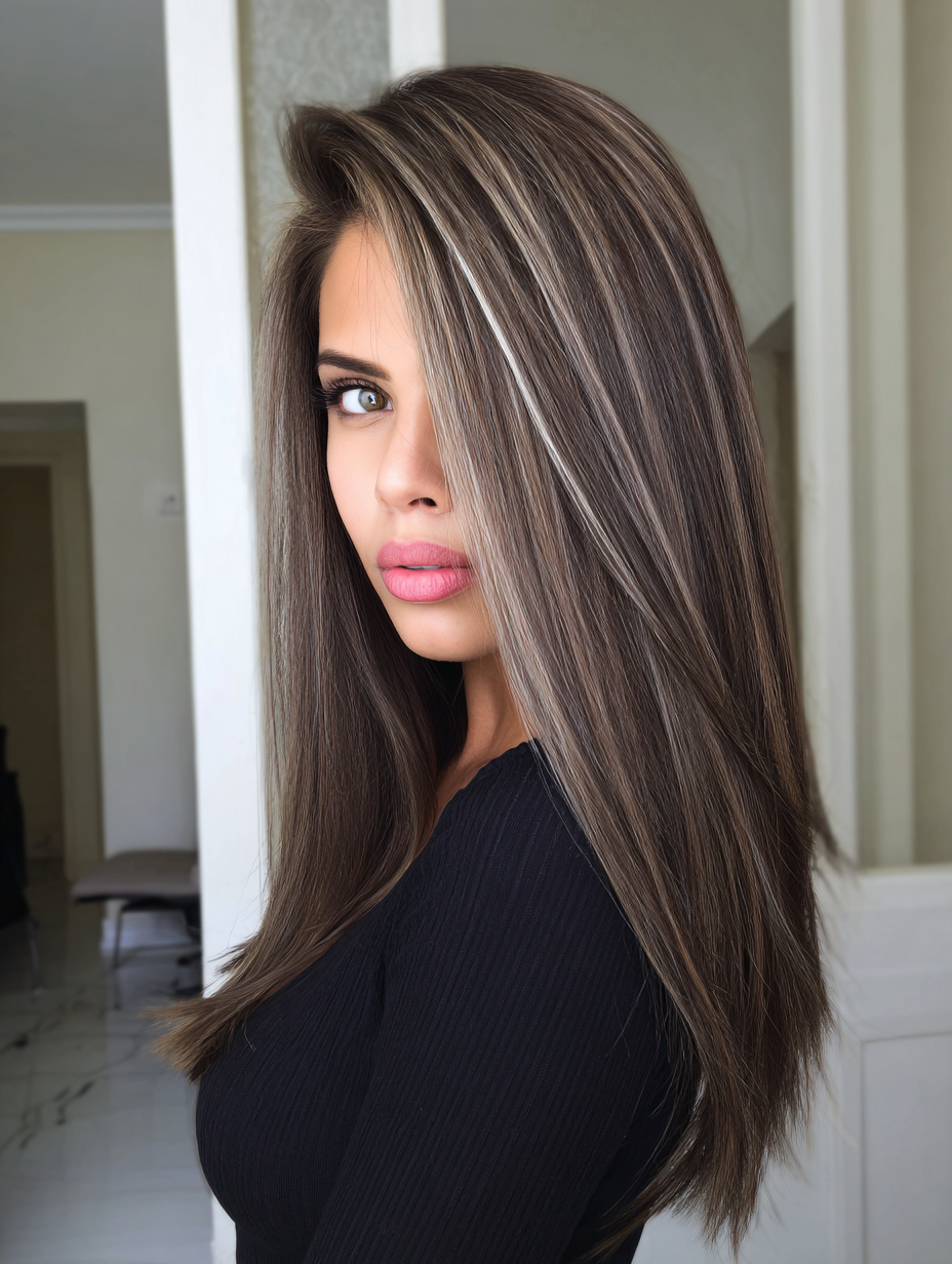 This straight hairstyle places thin silver ribbons evenly through a medium brown base. The lighter lines stay subtle, giving the hair a cool sheen without overwhelming the color.