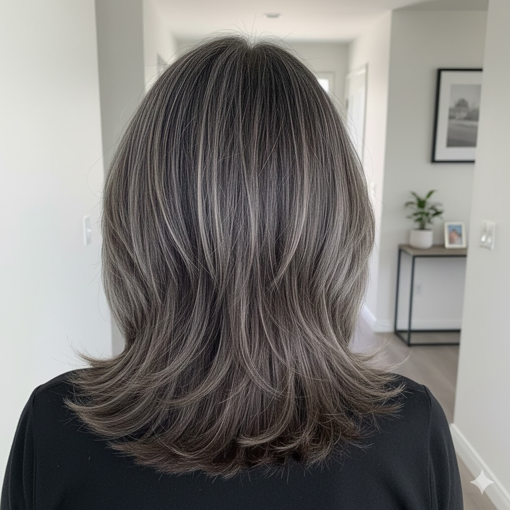 Medium lengths carry this blend well because the layers allow the silver to fall in gentle, flowing sections. The final result feels balanced, subtle, and easy to maintain.